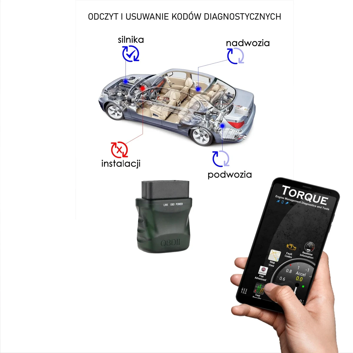 Wystarczy zainstalować jedną z aplikacji diagnostycznych dostępnych w Google Play (np. Torque, Car Scanner, OBD Auto Doctor), aby uzyskać pełny dostęp do parametrów pojazdu.