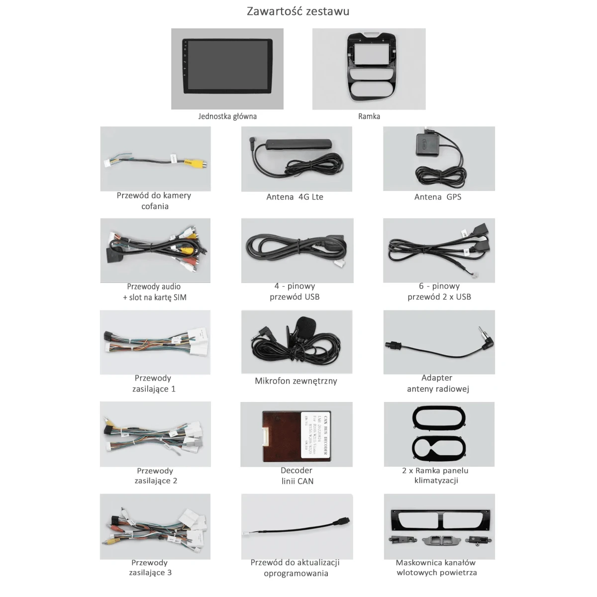 Wiązka zasilająca, antena GPS, antena LTE, kable USB