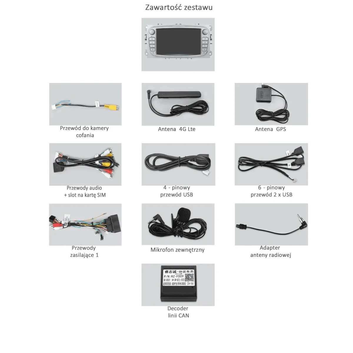 Wiązka zasilająca, antena GPS, antena LTE, kable USB